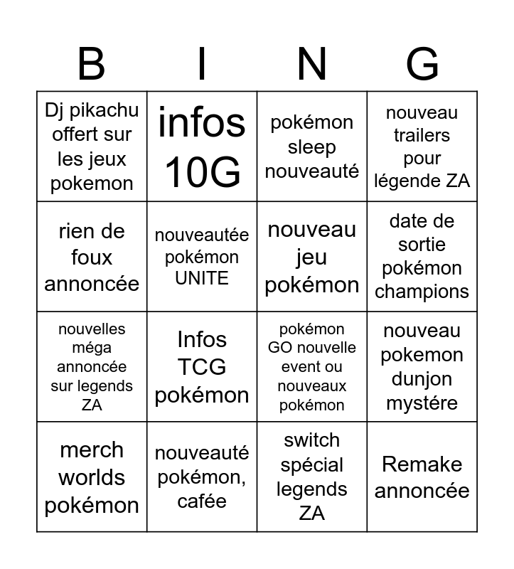This bingo card has 16 words: nouveauté pokémon, cafée, nouveau pokemon dunjon mystére, pokémon sleep nouveauté, Dj pikachu offert sur les jeux pokemon, nouvelles méga annoncée sur legends ZA, infos 10G, pokémon GO nouvelle event ou nouveaux pokémon, switch spécial legends ZA, rien de foux annoncée, nouveautée pokémon UNITE, merch worlds pokémon, nouveau trailers pour légende ZA, Infos TCG pokémon, date de sortie pokémon champions, nouveau jeu pokémon and Remake annoncée.