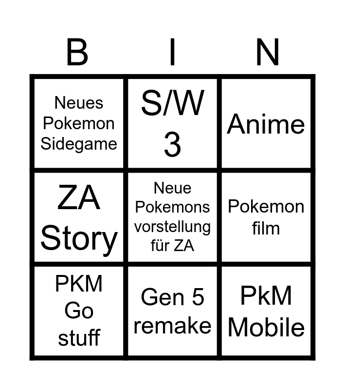 This bingo card has 12 words: Neue Megas in ZA, Gen 5 remake, PkM Mobile, ZA Story, S/W 3, Pokemon film, PKM Go stuff, TCG, Anime, Neues Pokemon Sidegame, Neue Pokemons vorstellung für ZA and Remake 2 Gen.