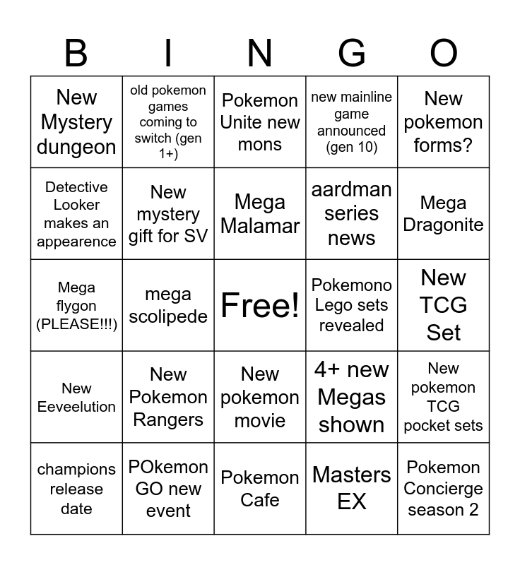This bingo card has a free space and 24 words: New Pokemon Rangers, POkemon GO new event, Mega Malamar, champions release date, New pokemon forms?, New Mystery dungeon, Detective Looker makes an appearence, old pokemon games coming to switch (gen 1+), Pokemono Lego sets revealed, New pokemon movie, aardman series news, Mega flygon (PLEASE!!!), 4+ new Megas shown, New pokemon TCG pocket sets, New mystery gift for SV, Masters EX, New TCG Set, Pokemon Unite new mons, Mega Dragonite, mega scolipede, Pokemon Concierge season 2, New Eeveelution, new mainline game announced (gen 10) and Pokemon Cafe.