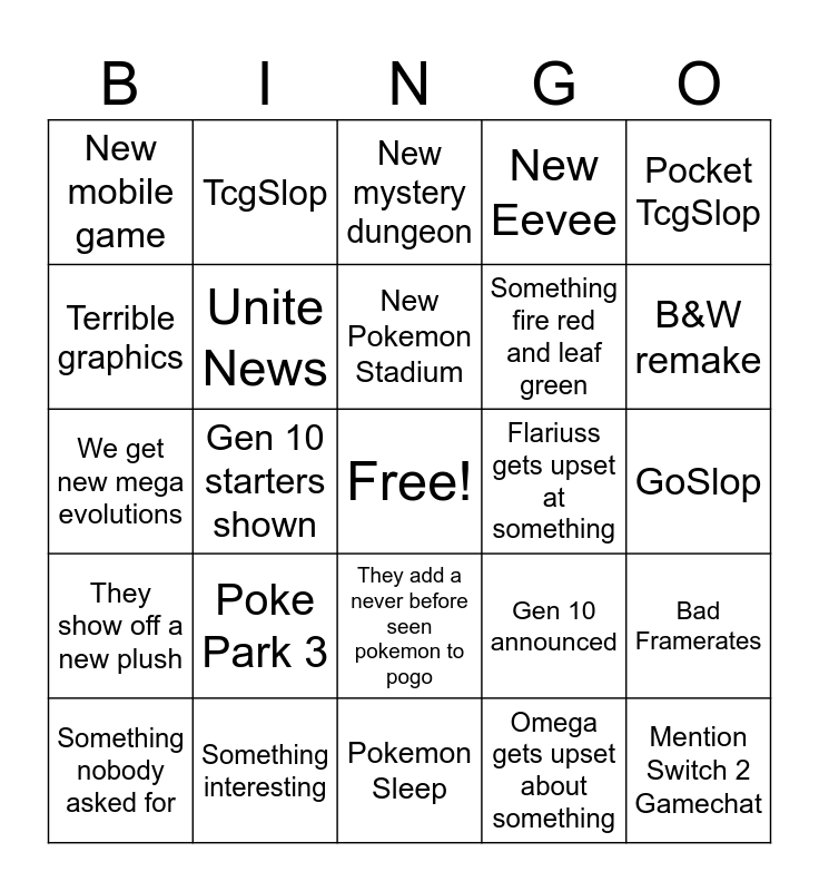 This bingo card has a free space and 24 words: Poke Park 3, Something interesting, New Pokemon Stadium, Something nobody asked for, Pocket TcgSlop, New mobile game, Terrible graphics, TcgSlop, Flariuss gets upset at something, They add a never before seen pokemon to pogo, Something fire red and leaf green, We get new mega evolutions, Gen 10 announced, Bad Framerates, Unite News, Omega gets upset about something, GoSlop, New mystery dungeon, B&W remake, Gen 10 starters shown, Mention Switch 2 Gamechat, They show off a new plush, New Eevee and Pokemon Sleep.