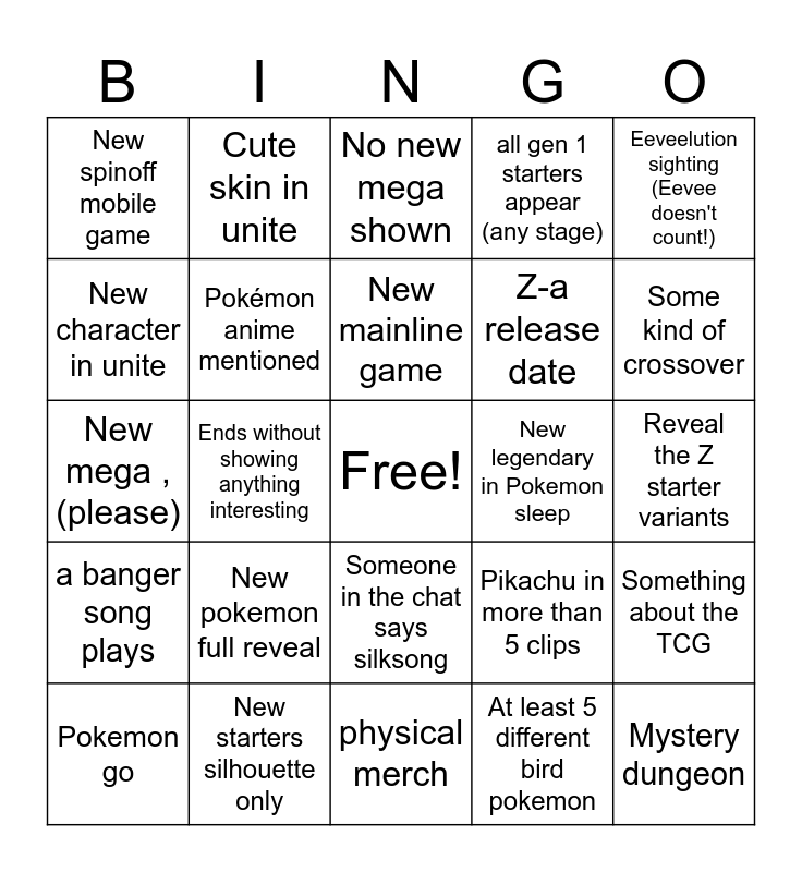 This bingo card has a free space and 24 words: New pokemon full reveal, New starters silhouette only, New mainline game, Pokemon go, Eeveelution sighting (Eevee doesn't count!), New spinoff mobile game, New character in unite, Cute skin in unite, New legendary in Pokemon sleep, Someone in the chat says silksong, Z-a release date, New mega ,(please), Pikachu in more than 5 clips, Something about the TCG, Pokémon anime mentioned, At least 5 different bird pokemon, Reveal the Z starter variants, No new mega shown, Some kind of crossover, Ends without showing anything interesting, Mystery dungeon, a banger song plays, all gen 1 starters appear (any stage) and physical merch.