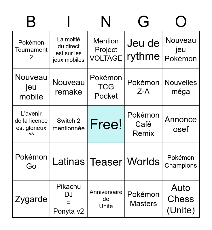 This bingo card has a free space and 24 words: Latinas, Pikachu DJ = Ponyta v2, Pokémon TCG Pocket, Zygarde, Nouveau jeu Pokémon, Pokémon Tournament 2, Nouveau jeu mobile, La moitié du direct est sur les jeux mobiles, Pokémon Café Remix, Teaser, Pokémon Z-A, L'avenir de la licence est glorieux ^^, Worlds, Pokémon Champions, Nouveau remake, Pokémon Masters, Annonce osef, Mention Project VOLTAGE, Nouvelles méga, Switch 2 mentionnée, Auto Chess (Unite), Pokémon Go, Jeu de rythme and Anniversaire de Unite.
