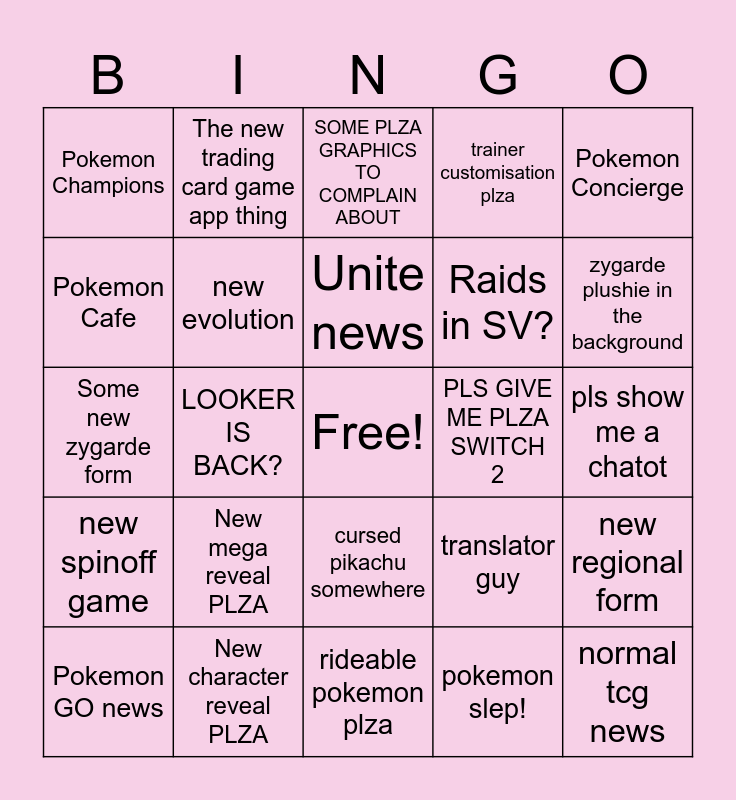 This bingo card has a free space and 24 words: New mega reveal PLZA, New character reveal PLZA, Unite news, Pokemon GO news, Pokemon Concierge, Pokemon Champions, Pokemon Cafe, The new trading card game app thing, PLS GIVE ME PLZA SWITCH 2, cursed pikachu somewhere, Raids in SV?, Some new zygarde form, translator guy, new regional form, new evolution, pokemon slep!, pls show me a chatot, SOME PLZA GRAPHICS TO COMPLAIN ABOUT, zygarde plushie in the background, LOOKER IS BACK?, normal tcg news, new spinoff game, trainer customisation plza and rideable pokemon plza.