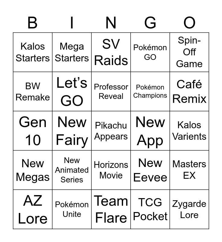 This bingo card has a free space and 24 words: New Animated Series, Pokémon Unite, Professor Reveal, AZ Lore, Spin-Off Game, Kalos Starters, BW Remake, Mega Starters, New App, Horizons Movie, Pokémon Champions, Gen 10, New Eevee, Masters EX, Let’s GO, TCG Pocket, Kalos Varients, SV Raids, Café Remix, New Fairy, Zygarde Lore, New Megas, Pokémon GO and Team Flare.