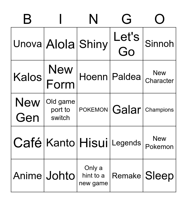 This bingo card has a free space and 24 words: Kanto, Johto, Hoenn, Anime, Sinnoh, Unova, Kalos, Alola, Galar, Hisui, Paldea, New Gen, Legends, New Pokemon, New Form, Remake, Champions, Shiny, New Character, Old game port to switch, Sleep, Café, Let's Go and Only a hint to a new game.