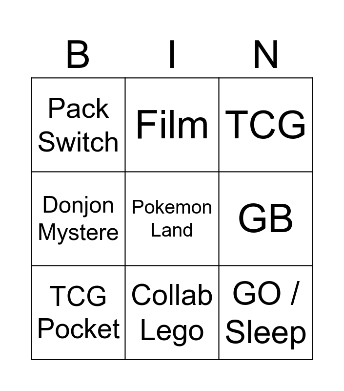 This bingo card has 9 words: TCG Pocket, TCG, Film, Donjon Mystere, Pack Switch, GB, Pokemon Land, GO / Sleep and Collab Lego.