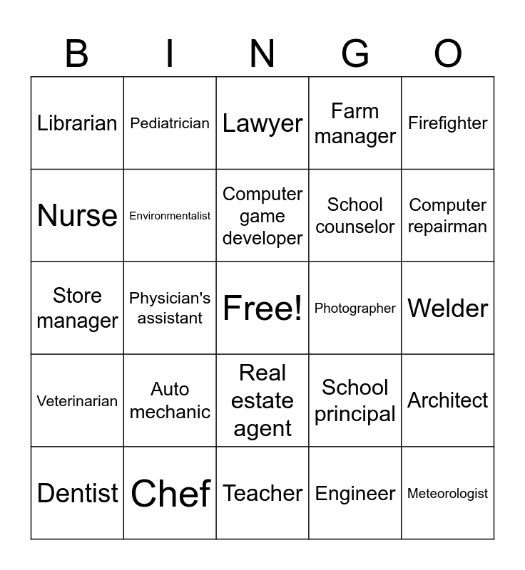 This bingo card has a free space and 24 words: Auto mechanic, Chef, Computer game developer, Dentist, Firefighter, Librarian, Nurse, Pediatrician, Photographer, Real estate agent, School counselor, Store manager, School principal, Architect, Environmentalist, Engineer, Welder, Lawyer, Computer repairman, Physician's assistant, Meteorologist, Veterinarian, Farm manager and Teacher.
