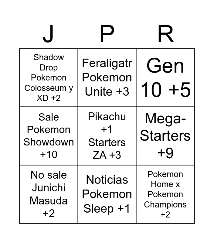 This bingo card has a free space and 8 words: Mega- Starters +9, Gen 10 +5, Feraligatr Pokemon Unite +3, No sale Junichi Masuda +2, Shadow Drop Pokemon Colosseum y XD +2, Pokemon Home x Pokemon Champions +2, Sale Pokemon Showdown +10 and Noticias Pokemon Sleep +1.