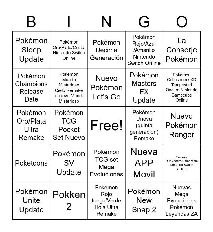 This bingo card has a free space and 29 words: Pokémon Unite Update, Pokémon Go Update, Pokémon TCG Pocket Set Nuevo, Pokémon Café Update, Pokémon Sleep Update, Pokémon Décima Generación, Pokémon Mundo MIsterioso Cielo Remake o nuevo Mundo Misterioso, Pokémon SV Update, Pokémon Unova (quinta generacion) Remake, Pokken 2, Nuevo Pokémon Ranger, Nuevas Mega Evoluciones Pokémon Leyendas ZA, Pokémon Rojo fuego/Verde Hoja Ultra Remake, Pokémon New Snap 2, Pokémon Colloseum / XD Tempestad Oscura Nintendo Gamecube Online, Merchandising Pokémon, Pokémon TCG set Mega Evoluciones, Poketoons, La Conserje Pokémon, Pokémon Oro/Plata Ultra Remake, Nueva APP Movil, Detective Pikachu 3 o Película Detective Pikachu 2, Pokémon Masters EX Update, Pokémon Champions Release Date, Pokémon Rojo/Azul /Amarillo Nintendo Switch Online, Pokémon Oro/Plata/Cristal Nintendo Switch Online, Pokémon Rubí/Zafiro/Esmeralda Nintendo Switch Online, Nuevo Pokémon Let's Go and Nueva PokePelícula.