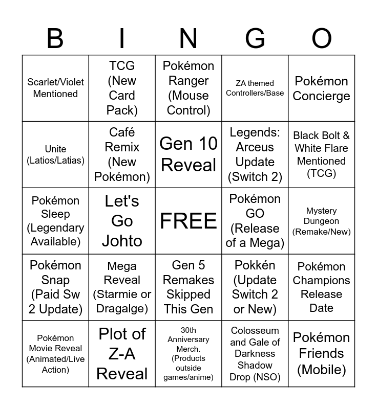 This bingo card has a free space and 24 words: Mega Reveal (Starmie or Dragalge), Plot of Z-A Reveal, Gen 10 Reveal, Pokémon Movie Reveal (Animated/Live Action), Pokémon Concierge, Scarlet/Violet Mentioned, Unite (Latios/Latias), TCG (New Card Pack), Pokémon GO (Release of a Mega), Gen 5 Remakes Skipped This Gen, Legends: Arceus Update (Switch 2), Pokémon Sleep (Legendary Available), Pokkén (Update Switch 2 or New), Pokémon Champions Release Date, Café Remix (New Pokémon), Colosseum and Gale of Darkness Shadow Drop (NSO), Mystery Dungeon (Remake/New), Pokémon Ranger (Mouse Control), Black Bolt & White Flare Mentioned (TCG), Let's Go Johto, Pokémon Friends (Mobile), Pokémon Snap (Paid Sw 2 Update), ZA themed Controllers/Base and 30th Anniversary Merch. (Products outside games/anime).