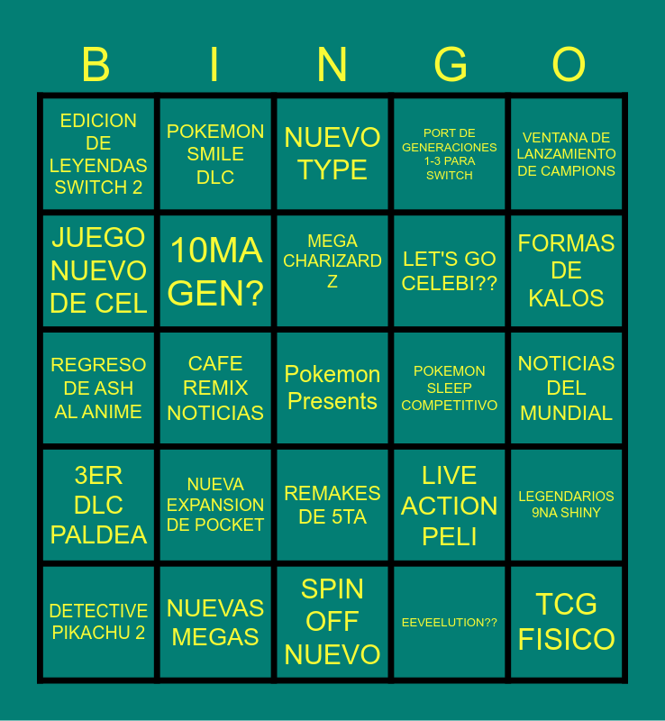This bingo card has a free space and 24 words: NUEVA EXPANSION DE POCKET, NUEVAS MEGAS, MEGA CHARIZARD Z, DETECTIVE PIKACHU 2, VENTANA DE LANZAMIENTO DE CAMPIONS, EDICION DE LEYENDAS SWITCH 2, JUEGO NUEVO DE CEL, POKEMON SMILE DLC, POKEMON SLEEP COMPETITIVO, REMAKES DE 5TA, LET'S GO CELEBI??, REGRESO DE ASH AL ANIME, LIVE ACTION PELI, LEGENDARIOS 9NA SHINY, 10MA GEN?, EEVEELUTION??, NOTICIAS DEL MUNDIAL, NUEVO TYPE, FORMAS DE KALOS, CAFE REMIX NOTICIAS, TCG FISICO, 3ER DLC PALDEA, PORT DE GENERACIONES 1-3 PARA SWITCH and SPIN OFF NUEVO.