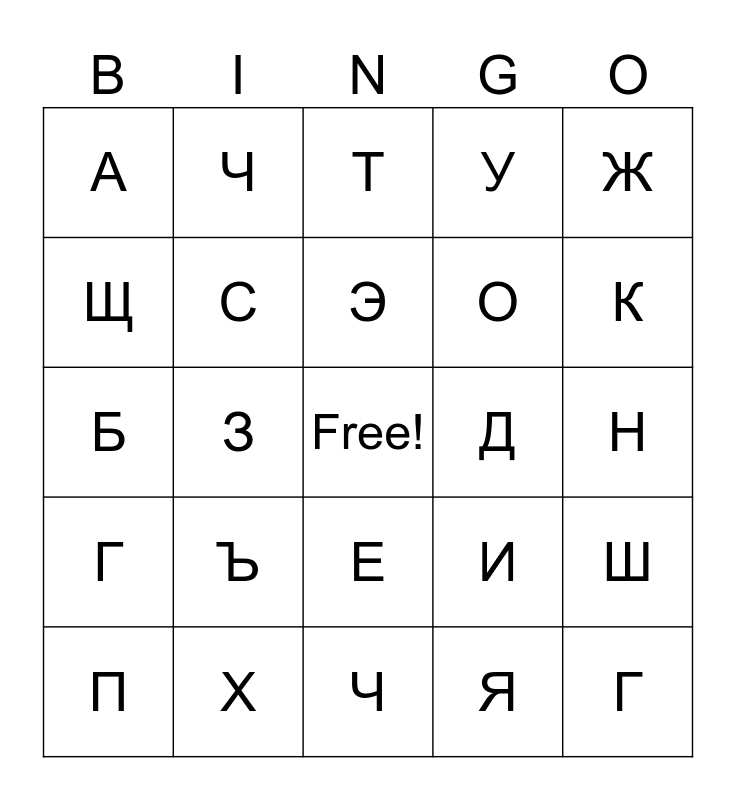 This bingo card has a free space and 29 words: П, Л, З, Н, А, Т, С, Ъ, Д, Х, Н, Г, Ч, Я, К, Ы, Е, Г, Ж, Б, И, Й, О, Щ, У, Ч, Ш, Э and Ю.