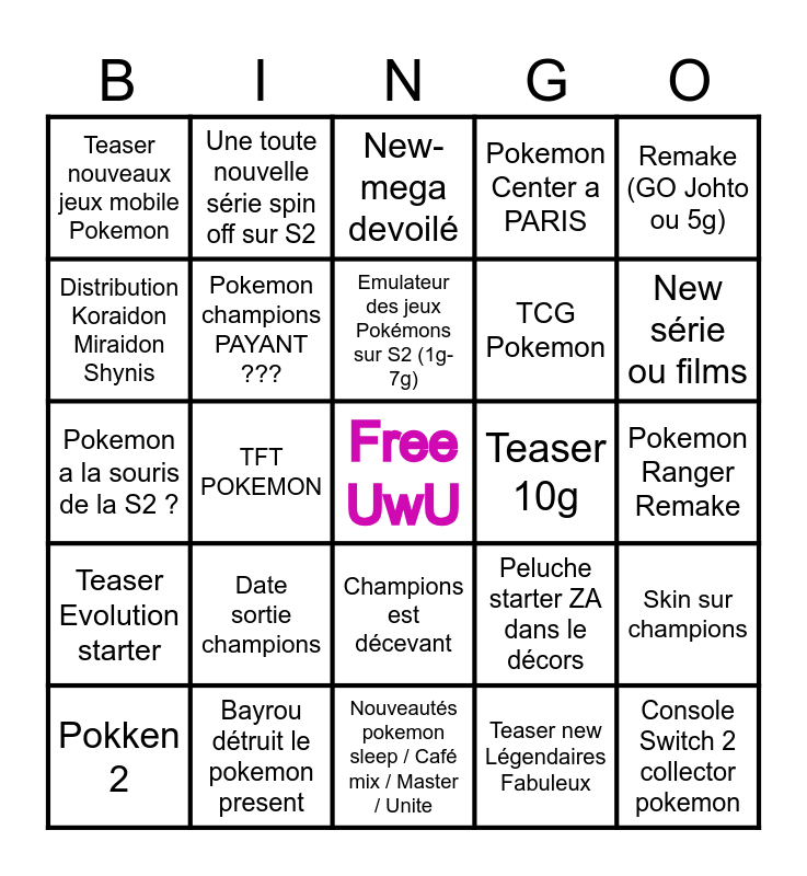 This bingo card has a free space and 24 words: Date sortie champions, Bayrou détruit le pokemon present, Emulateur des jeux Pokémons sur S2 (1g-7g), Pokken 2, Remake (GO Johto ou 5g), Teaser nouveaux jeux mobile Pokemon, Distribution Koraidon Miraidon Shynis, Une toute nouvelle série spin off sur S2, Teaser 10g, Champions est décevant, TCG Pokemon, Pokemon a la souris de la S2 ?, Peluche starter ZA dans le décors, Skin sur champions, Pokemon champions PAYANT ???, Teaser new Légendaires Fabuleux, Pokemon Ranger Remake, New-mega devoilé, New série ou films, TFT POKEMON, Console Switch 2 collector pokemon, Teaser Evolution starter, Pokemon Center a PARIS and Nouveautés pokemon sleep / Café mix / Master / Unite.
