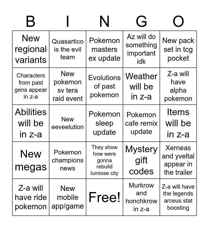 This bingo card has 25 words: New megas, New mobile app/game, Pokemon sleep update, Murkrow and honchkrow in z-a, New pack set in tcg pocket, New regional variants, Quasartico is the evil team, Pokemon masters ex update, Pokemon cafe remix update, Xerneas and yveltal appear in the trailer, Characters from past gens appear in z-a, New pokemon sv tera raid event, Free!, Mystery gift codes, Z-a will have alpha pokemon, Z-a will have ride pokemon, New eeveelution, Evolutions of past pokemon, Weather will be in z-a, Items will be in z-a, Abilities will be in z-a, Pokemon champions news, They show how were gonna rebuild lumiose city, Az will do something important idk and Z-a will have the legends arceus stat boosting.
