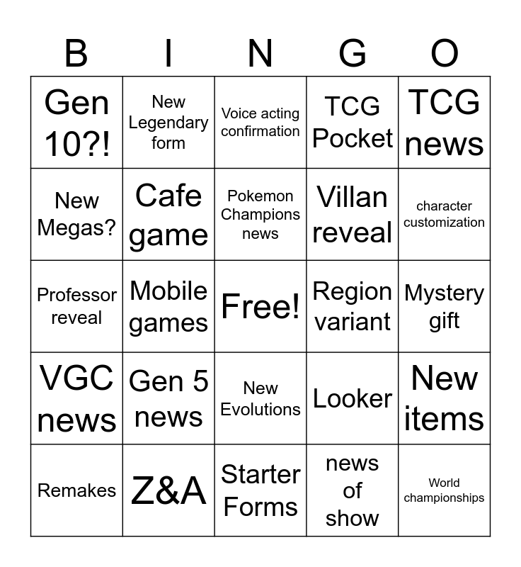 This bingo card has a free space and 24 words: Gen 5 news, Z&A, Pokemon Champions news, Remakes, TCG news, Gen 10?!, New Megas?, New Legendary form, Region variant, New Evolutions, Villan reveal, Professor reveal, Looker, New items, Cafe game, news of show, Mystery gift, Voice acting confirmation, character customization, Mobile games, World championships, VGC news, TCG Pocket and Starter Forms.