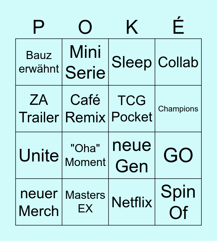 This bingo card has 16 words: Masters EX, GO, Sleep, Bauz erwähnt, Unite, Mini Serie, neue Gen, Netflix, ZA Trailer, Café Remix, neuer Merch, Collab, "Oha" Moment, Champions, TCG Pocket and Spin Of.