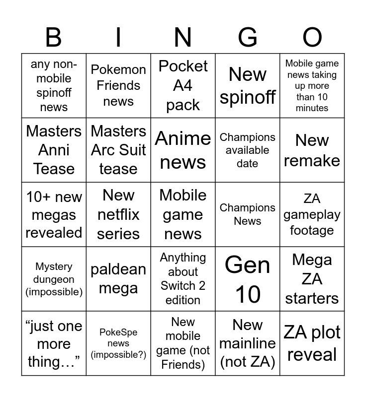This bingo card has a free space and 24 words: paldean mega, PokeSpe news (impossible?), Anime news, “just one more thing…”, Mobile game news taking up more than 10 minutes, any non-mobile spinoff news, Masters Anni Tease, Pokemon Friends news, Champions News, Anything about Switch 2 edition, Champions available date, 10+ new megas revealed, Gen 10, Mega ZA starters, Masters Arc Suit tease, New mainline (not ZA), ZA gameplay footage, Pocket A4 pack, New remake, New netflix series, ZA plot reveal, Mystery dungeon (impossible), New spinoff and New mobile game (not Friends).