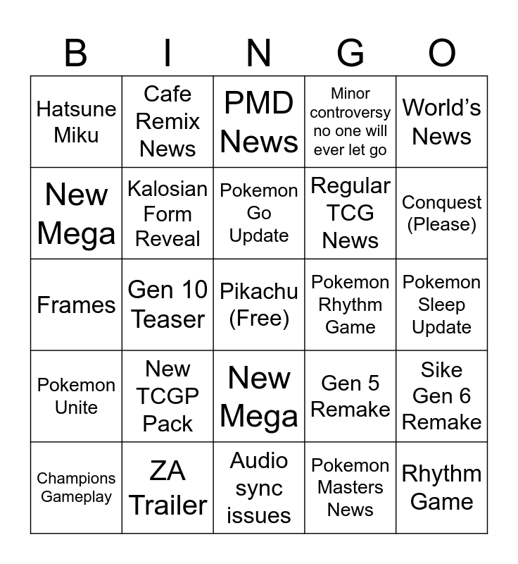 This bingo card has a free space and 24 words: New TCGP Pack, ZA Trailer, Pokemon Go Update, Champions Gameplay, World’s News, Hatsune Miku, New Mega, Cafe Remix News, Pokemon Rhythm Game, New Mega, Regular TCG News, Frames, Gen 5 Remake, Sike Gen 6 Remake, Kalosian Form Reveal, Pokemon Masters News, Pokemon Sleep Update, PMD News, Conquest (Please), Gen 10 Teaser, Rhythm Game, Pokemon Unite, Minor controversy no one will ever let go and Audio sync issues.