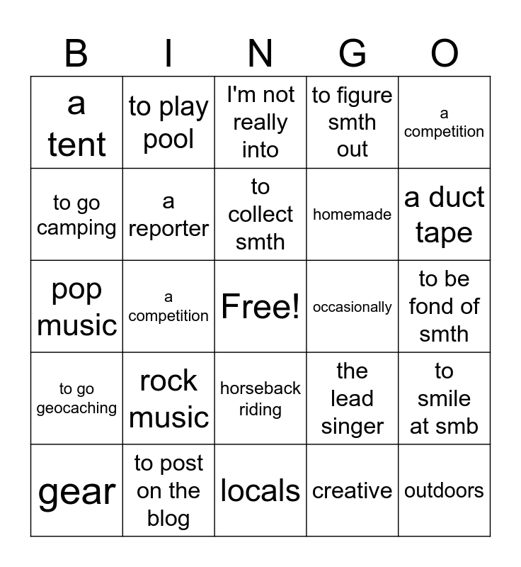 This bingo card has a free space and 24 words: rock music, to post on the blog, to collect smth, gear, a competition, a tent, to go camping, to play pool, occasionally, horseback riding, homemade, pop music, the lead singer, to smile at smb, a reporter, creative, to be fond of smth, I'm not really into, a duct tape, a competition, outdoors, to go geocaching, to figure smth out and locals.