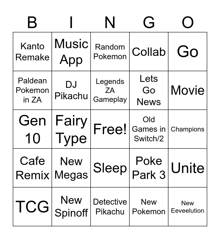 This bingo card has a free space and 24 words: New Megas, New Spinoff, Legends ZA Gameplay, TCG, Go, Kanto Remake, Paldean Pokemon in ZA, Music App, Old Games in Switch/2, Sleep, Lets Go News, Gen 10, Poke Park 3, Unite, DJ Pikachu, New Pokemon, Champions, Random Pokemon, Movie, Fairy Type, New Eeveelution, Cafe Remix, Collab and Detective Pikachu.