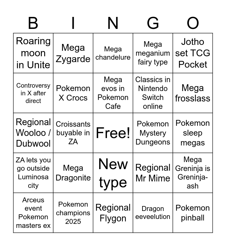 This bingo card has a free space and 24 words: Mega Dragonite, Pokemon champions 2025, Mega evos in Pokemon Cafe, Arceus event Pokemon masters ex, Jotho set TCG Pocket, Roaring moon in Unite, Controversy in X after direct, Mega Zygarde, Pokemon Mystery Dungeons, New type, Classics in Nintendo Switch online, Regional Wooloo / Dubwool, Regional Mr Mime, Mega Greninja is Greninja-ash, Pokemon X Crocs, Dragon eeveelution, Pokemon sleep megas, Mega chandelure, Mega frosslass, Croissants buyable in ZA, Pokemon pinball, ZA lets you go outside Luminosa city, Mega meganium fairy type and Regional Flygon.