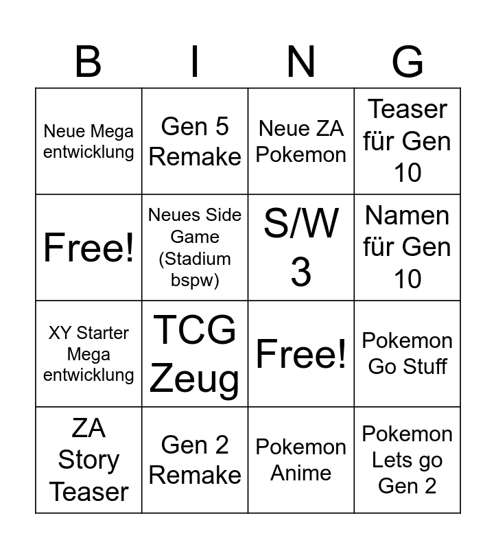 This bingo card has 16 words: Gen 2 Remake, Pokemon Go Stuff, Neue ZA Pokemon, Neue Mega entwicklung, XY Starter Mega entwicklung, Gen 5 Remake, Free!, Pokemon Anime, Free!, Neues Side Game (Stadium bspw), ZA Story Teaser, Teaser für Gen 10, TCG Zeug, Namen für Gen 10, S/W 3 and Pokemon Lets go Gen 2.