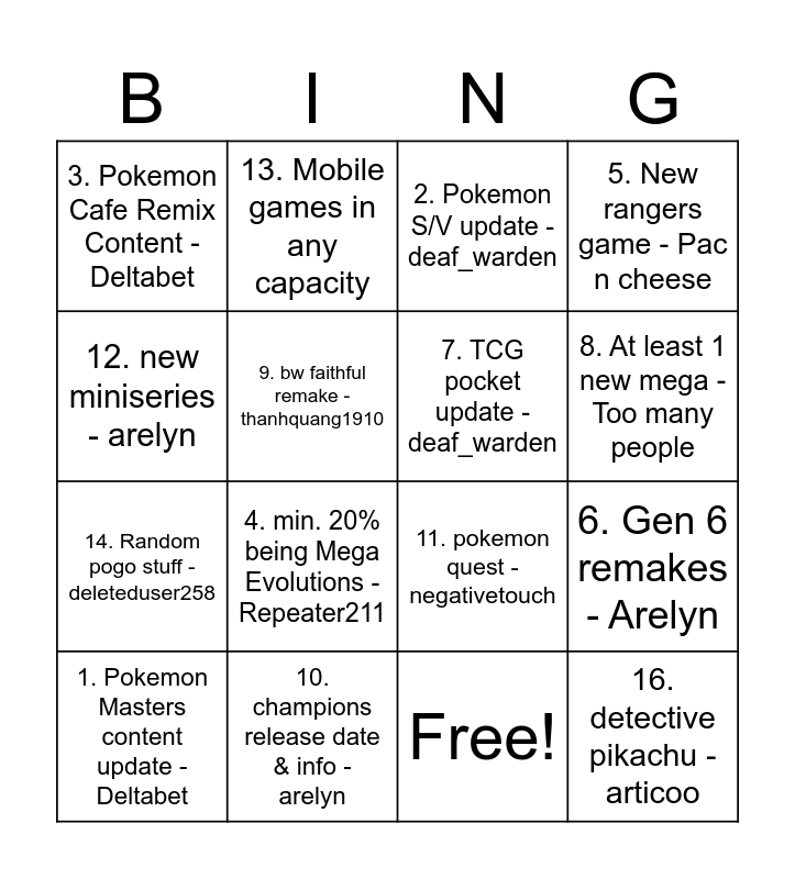 This bingo card has 17 words: Free!, 1. Pokemon Masters content update - Deltabet, 2. Pokemon S/V update - deaf_warden, 3. Pokemon Cafe Remix Content - Deltabet, 4. min. 20% being Mega Evolutions - Repeater211, 5. New rangers game - Pac n cheese, 6. Gen 6 remakes - Arelyn, 7. TCG pocket update - deaf_warden, 8. At least 1 new mega - Too many people, 9. bw faithful remake - thanhquang1910, 10. champions release date & info - arelyn, 11. pokemon quest - negativetouch, 12. new miniseries - arelyn, 13. Mobile games in any capacity, 14. Random pogo stuff - deleteduser258, 15. ZA gameplay - articoo and 16. detective pikachu - articoo.