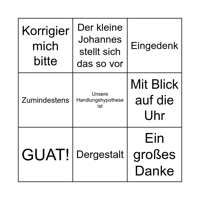 This bingo card has a free space and 8 words: Mit Blick auf die Uhr, Eingedenk, Der kleine Johannes stellt sich das so vor, GUAT!, Korrigier mich bitte, Ein großes Danke, Zumindestens and Dergestalt.