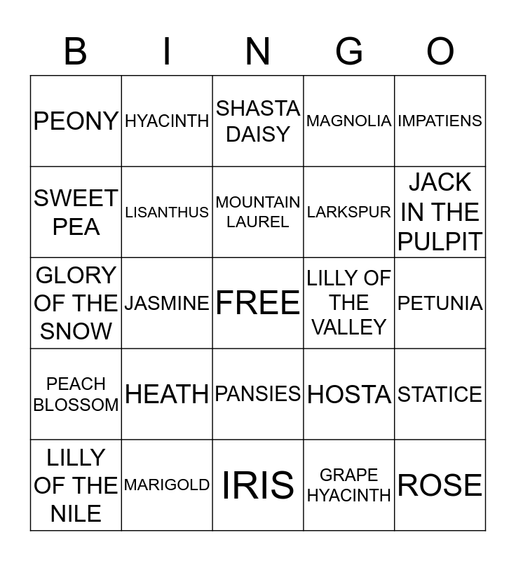 This bingo card has a free space and 24 words: HEATH, MARIGOLD, MOUNTAIN LAUREL, LILLY OF THE NILE, IMPATIENS, PEONY, SWEET PEA, HYACINTH, LILLY OF THE VALLEY, PANSIES, LARKSPUR, GLORY OF THE SNOW, HOSTA, STATICE, LISANTHUS, GRAPE HYACINTH, PETUNIA, SHASTA DAISY, JACK IN THE PULPIT, JASMINE, ROSE, PEACH BLOSSOM, MAGNOLIA and IRIS.
