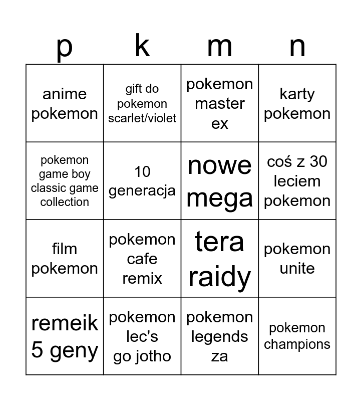 This bingo card has 16 words: pokemon lec's go jotho, pokemon unite, pokemon master ex, anime pokemon, film pokemon, gift do pokemon scarlet/violet, tera raidy, pokemon legends za, pokemon game boy classic game collection, 10 generacja, remeik 5 geny, karty pokemon, pokemon cafe remix, coś z 30 leciem pokemon, nowe mega and pokemon champions.