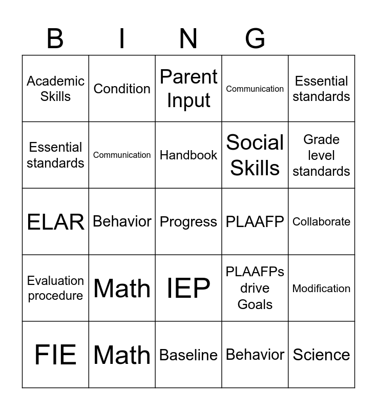 This bingo card has a free space and 89 words: Free!, PLAAFP, IEP, Vertical Alignment, Timeline, Condition, Behavior, Criterion, Benchmark, Objective, Goal, Accommodation, Modification, Collaborate, Assessment, Handbook, Critical skills, Data, IDEA, Measurable, Prompt hierarchy, STAAR Alt 2, Baseline, Embrace, ELAR, Math, Science, Social Studies, Daily Living Skills, Social Skills, Communication, Behavior, Functional Skills, Academic Skills, "Can do", Parent Input, Essential standards, TEKS, Grade level standards, FIE, Evaluation procedure, Mastery, Sequential skills, Discrete skill components, PLAAFPs drive Goals, PLAAFP, IEP, Vertical Alignment, Timeline, Condition, Criterion, Progress, Benchmark, Objective, Goal, Accommodation, Modification, Collaborate, Assessment, Handbook, Critical skills, Data, IDEA, Measurable, Prompt hierarchy, STAAR Alt 2, Baseline, Embrace, ELAR, Math, Science, Social Studies, Daily Living Skills, Social Skills, Communication, Behavior, Functional Skills, Academic Skills, "Can do", Parent Input, Essential standards, TEKS, Grade level standards, FIE, Evaluation procedure, Mastery, Sequential skills, Discrete skill components and PLAAFPs drive Goals.