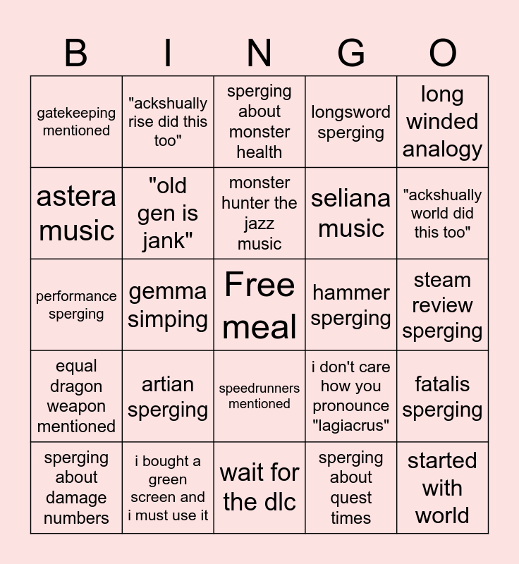 This bingo card has a free space and 44 words: food analogy, started with world, i enjoyed wilds anyways, sperging about damage numbers, doesn't talk about monster mechanics, sperging about quest times, sperging about monster health, your first monster hunter is the hardest, long winded analogy, i bought a green screen and i must use it, longsword sperging, hammer sperging, speedrunners mentioned, artian sperging, "seamless", wait for the dlc, wait for title updates, performance sperging, "i actually liked the story", "ackshually world did this too", "ackshually rise did this too", playing GU, counter sperging, gatekeeping mentioned, "it's always been like this", steam review sperging, steamcharts sperging, "low rank is the tutorial", i don't care how you pronounce "lagiacrus", equal dragon weapon mentioned, alatreon sperging, fatalis sperging, egg quest sperging, "just dont use it bro", gemma simping, alma simping, "monster hunter isn't about the story", pokke village music, monster hunter the jazz music, astera music, seliana music, "it has the potential to be the best game in the series", "old gen is jank" and meta sperging.