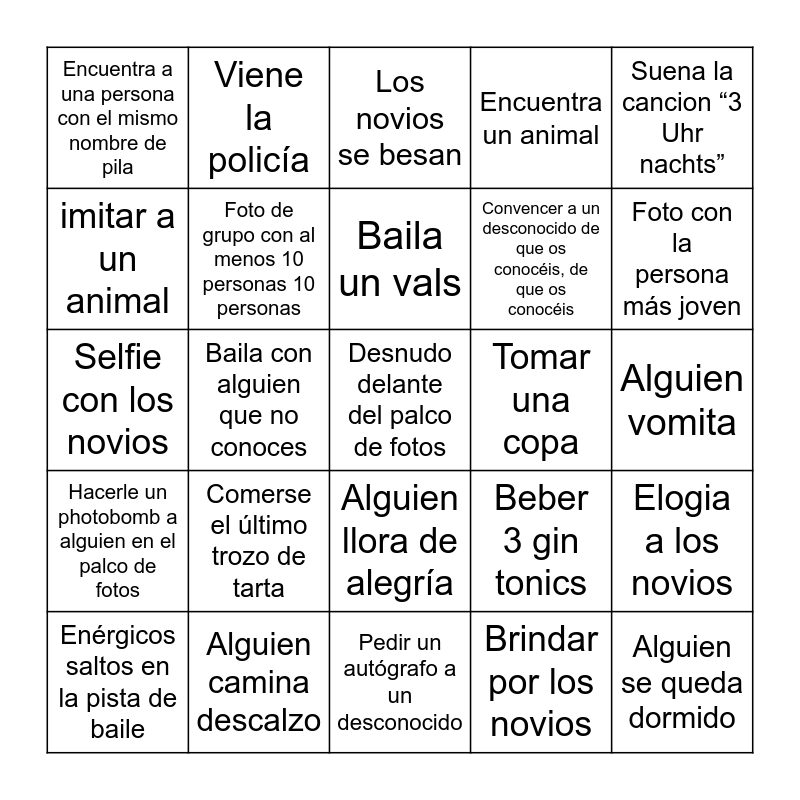 This bingo card has 30 words: Alguien camina descalzo, Baila con una pareja, Baila con alguien que no conoces, Se rompe un cristal, Encuentra a una persona con el mismo nombre de pila, Los novios se besan, Foto de grupo con al menos 10 personas 10 personas, Alguien llora de alegría, Tomar una copa, Pedir un autógrafo a un desconocido, Alguien vomita, Desnudo delante del palco de fotos, Brindar por los novios, Alguien se queda dormido, Foto con la persona más joven, Foto con la persona más mayor, Beber 3 gin tonics, Hacerle un photobomb a alguien en el palco de fotos, Comerse el último trozo de tarta, Suena la cancion “3 Uhr nachts”, Selfie con los novios, El novio se levanta, Viene la policía, Convencer a un desconocido de que os conocéis, de que os conocéis, imitar a un animal, Encuentra un animal, Elogia a los novios, Enérgicos saltos en la pista de baile, Baila un vals and Alguien busca su vaso.
