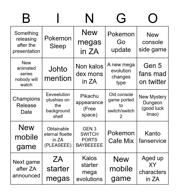 This bingo card has a free space and 24 words: Obtainable eternal floette in ZA (PLEASEEE), ZA starter megas, Non kalos dex mons in ZA, Next game after ZA announced, New console side game, Something releasing after the presentation, New animated series nobody will watch, Pokemon Sleep, Old console game ported to switch/switch 2, GEN 3 SWITCH PORTS BAYBEEEEE, A new mega evolution changes type, Champions Release Date, Pokemon Cafe Mix, Kanto fanservice, Johto mention, New mobile game, New Mystery Dungeon (good luck lmao), New megas in ZA, Gen 5 fans mad on twitter, Eeveelution plushies on the background shelf, Aged up XY characters in ZA, New mobile game, Pokemon Go update and Kalos starter mega evolutions.