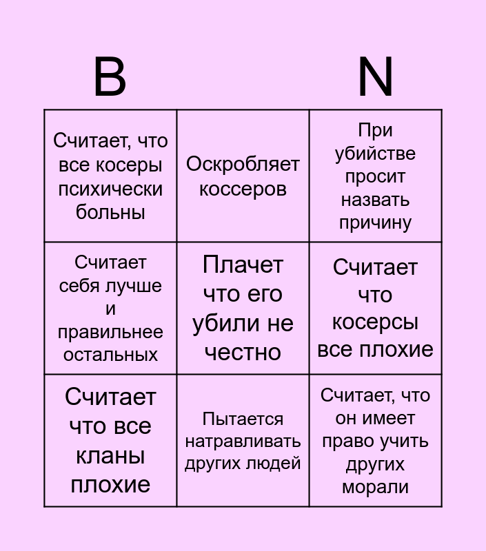 This bingo card has a free space and 8 words: Считает что косерсы все плохие, При убийстве просит назвать причину, Оскробляет коссеров, Считает что все кланы плохие, Считает, что все косеры психически больны, Считает, что он имеет право учить других морали, Считает себя лучше и правильнее остальных and Пытается натравливать других людей.
