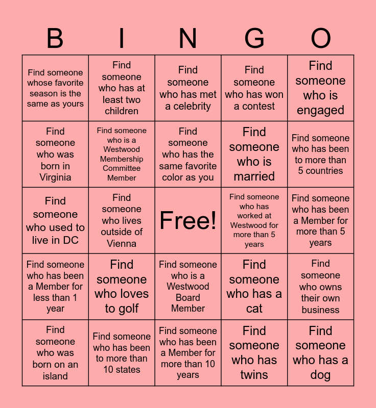 This bingo card has a free space and 29 words: Find someone who was born on an island, Find someone who lives in Vienna, Find someone who lives outside of Vienna, Find someone who has at least 2 siblings, Find someone whose favorite season is the same as yours, Find someone who has met a celebrity, Find someone who is a Westwood Membership Committee Member, Find someone who loves to golf, Find someone who has worked at Westwood for more than 5 years, Find someone who has been to more than 10 states, Find someone who has been a Member for more than 5 years, Find someone who has a dog, Find someone who has been a Member for more than 10 years, Find someone who has twins, Find someone who has been to more than 5 countries, Find someone who loves to play tennis, Find someone who is a Westwood Board Member, Find someone who has been a Member for less than 1 year, Find someone who is engaged, Find someone who used to live in DC, Find someone who has a cat, Find someone who has broken a bone, Find someone who is married, Find someone who was born in Virginia, Find someone who has won a contest, Find someone who has at least two children, Find someone who owns their own business, Find someone who has the same favorite color as you and Find someone who has worked at Westwood for less than 5 years.