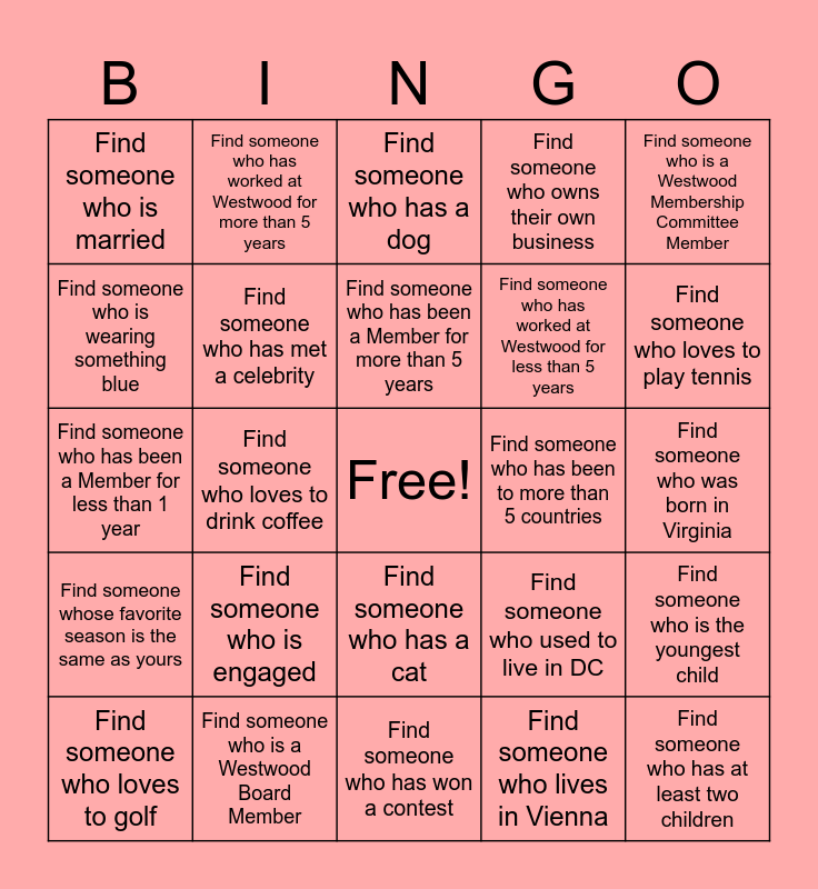 This bingo card has a free space and 34 words: Find someone who was born on an island, Find someone who lives in Vienna, Find someone who lives outside of Vienna, Find someone who has at least 2 siblings, Find someone whose favorite season is the same as yours, Find someone who has met a celebrity, Find someone who is a Westwood Membership Committee Member, Find someone who loves to golf, Find someone who has worked at Westwood for more than 5 years, Find someone who has been to more than 10 states, Find someone who has been a Member for more than 5 years, Find someone who has a dog, Find someone who has been a Member for more than 10 years, Find someone who has twins, Find someone who has been to more than 5 countries, Find someone who loves to play tennis, Find someone who is a Westwood Board Member, Find someone who has been a Member for less than 1 year, Find someone who is engaged, Find someone who used to live in DC, Find someone who has a cat, Find someone who has broken a bone, Find someone who is married, Find someone who was born in Virginia, Find someone who has won a contest, Find someone who has at least two children, Find someone who owns their own business, Find someone who has the same favorite color as you, Find someone who has worked at Westwood for less than 5 years, Find someone who is wearing something blue, Find someone who speaks multiple languages, Find someone who loves to drink coffee, Find someone who is the youngest child and Find someone who is the oldest child.