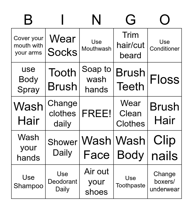 This bingo card has a free space and 24 words: Shower Daily, Use Deodorant Daily, Soap to wash hands, Use Shampoo, Use Conditioner, Cover your mouth with your arms, use Body Spray, Wear Socks, Wear Clean Clothes, Wash Face, Brush Teeth, Wash Hair, Wash Body, Clip nails, Tooth Brush, Use Toothpaste, Brush Hair, Use Mouthwash, Floss, Change clothes daily, Change boxers/ underwear, Wash your hands, Trim hair/cut beard and Air out your shoes.