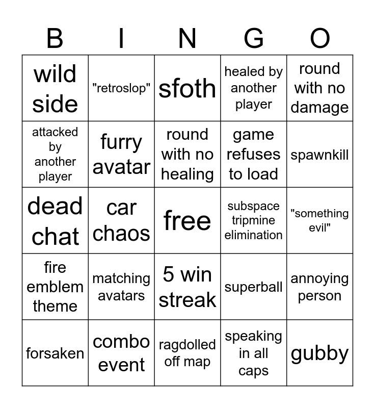 This bingo card has a free space and 24 words: matching avatars, combo event, round with no healing, forsaken, round with no damage, wild side, attacked by another player, "retroslop", subspace tripmine elimination, 5 win streak, game refuses to load, dead chat, superball, annoying person, furry avatar, speaking in all caps, "something evil", sfoth, spawnkill, car chaos, gubby, fire emblem theme, healed by another player and ragdolled off map.