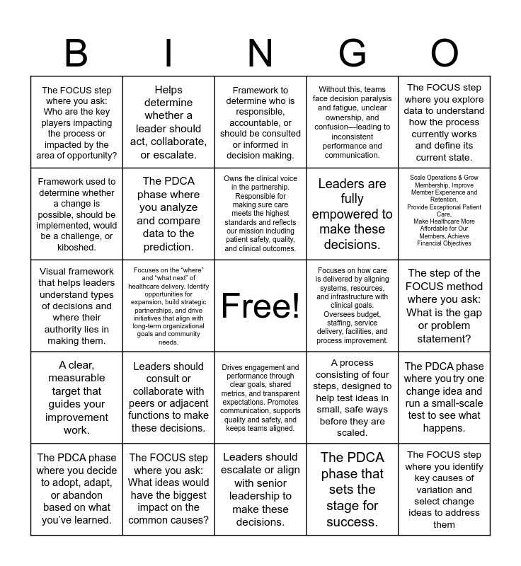 This bingo card has a free space and 24 words: Leaders should consult or collaborate with peers or adjacent functions to make these decisions., The FOCUS step where you ask: What ideas would have the biggest impact on the common causes?, Owns the clinical voice in the partnership. Responsible for making sure care meets the highest standards and reflects our mission including patient safety, quality, and clinical outcomes., The PDCA phase where you decide to adopt, adapt, or abandon based on what you’ve learned., The FOCUS step where you explore data to understand how the process currently works and define its current state., The FOCUS step where you ask: Who are the key players impacting the process or impacted by the area of opportunity?, Framework used to determine whether a change is possible, should be implemented, would be a challenge, or kiboshed., Helps determine whether a leader should act, collaborate, or escalate., Focuses on how care is delivered by aligning systems, resources, and infrastructure with clinical goals. Oversees budget, staffing, service delivery, facilities, and process improvement., Drives engagement and performance through clear goals, shared metrics, and transparent expectations. Promotes communication, supports quality and safety, and keeps teams aligned., Leaders are fully empowered to make these decisions., Visual framework that helps leaders understand types of decisions and where their authority lies in making them., A process consisting of four steps, designed to help test ideas in small, safe ways before they are scaled., The PDCA phase where you try one change idea and run a small-scale test to see what happens., The PDCA phase where you analyze and compare data to the prediction., The PDCA phase that sets the stage for success., The step of the FOCUS method where you ask: What is the gap or problem statement?, Framework to determine who is responsible, accountable, or should be consulted or informed in decision making., Scale Operations & Grow Membership, Improve Member Experience and Retention, Provide Exceptional Patient Care, Make Healthcare More Affordable for Our Members, Achieve Financial Objectives, Focuses on the “where” and “what next” of healthcare delivery. Identify opportunities for expansion, build strategic partnerships, and drive initiatives that align with long-term organizational goals and community needs., The FOCUS step where you identify key causes of variation and select change ideas to address them, A clear, measurable target that guides your improvement work., Without this, teams face decision paralysis and fatigue, unclear ownership, and confusion—leading to inconsistent performance and communication. and Leaders should escalate or align with senior leadership to make these decisions..