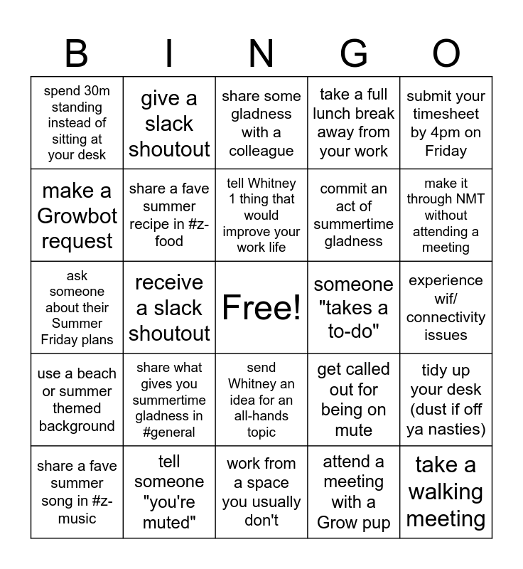 This bingo card has a free space and 24 words: share what gives you summertime gladness in #general, tell someone "you're muted", tell Whitney 1 thing that would improve your work life, share a fave summer song in #z-music, submit your timesheet by 4pm on Friday, spend 30m standing instead of sitting at your desk, make a Growbot request, give a slack shoutout, someone "takes a to-do", send Whitney an idea for an all-hands topic, commit an act of summertime gladness, ask someone about their Summer Friday plans, get called out for being on mute, tidy up your desk (dust if off ya nasties), share a fave summer recipe in #z-food, attend a meeting with a Grow pup, experience wif/ connectivity issues, share some gladness with a colleague, make it through NMT without attending a meeting, receive a slack shoutout, take a walking meeting, use a beach or summer themed background, take a full lunch break away from your work and work from a space you usually don't.