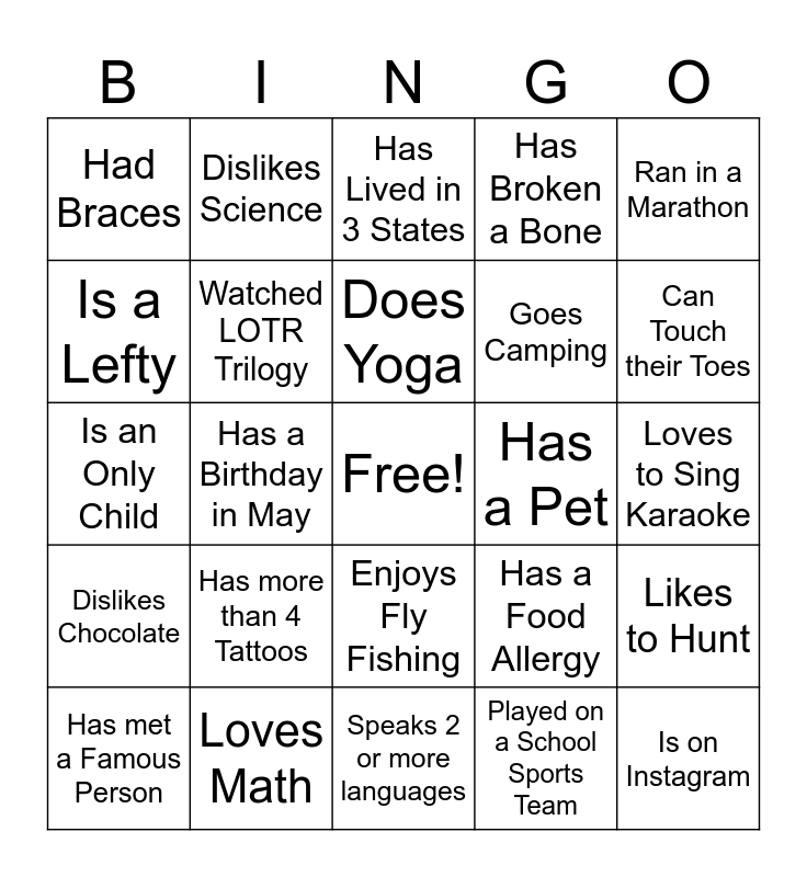 This bingo card has a free space and 25 words: Has more than 4 Tattoos, Speaks 2 or more languages, Does Yoga, Has met a Famous Person, Ran in a Marathon, Had Braces, Is a Lefty, Dislikes Science, Has a Pet, Enjoys Fly Fishing, Goes Camping, Is an Only Child, Has a Food Allergy, Likes to Hunt, Watched LOTR Trilogy, Can Play an Instrument, Loves to Sing Karaoke, Has Lived in 3 States, Can Touch their Toes, Has a Birthday in May, Is on Instagram, Loves Math, Dislikes Chocolate, Has Broken a Bone and Played on a School Sports Team.