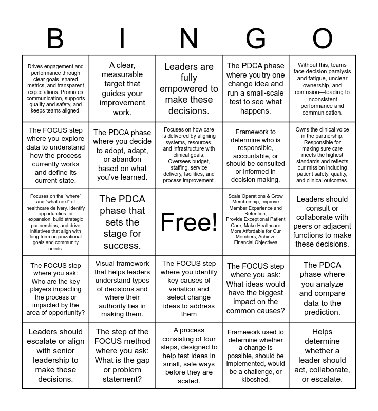 This bingo card has a free space and 24 words: Visual framework that helps leaders understand types of decisions and where their authority lies in making them., The step of the FOCUS method where you ask: What is the gap or problem statement?, Focuses on how care is delivered by aligning systems, resources, and infrastructure with clinical goals. Oversees budget, staffing, service delivery, facilities, and process improvement., Leaders should escalate or align with senior leadership to make these decisions., Without this, teams face decision paralysis and fatigue, unclear ownership, and confusion—leading to inconsistent performance and communication., Drives engagement and performance through clear goals, shared metrics, and transparent expectations. Promotes communication, supports quality and safety, and keeps teams aligned., The FOCUS step where you explore data to understand how the process currently works and define its current state., A clear, measurable target that guides your improvement work., Scale Operations & Grow Membership, Improve Member Experience and Retention, Provide Exceptional Patient Care, Make Healthcare More Affordable for Our Members, Achieve Financial Objectives, The FOCUS step where you identify key causes of variation and select change ideas to address them, Framework to determine who is responsible, accountable, or should be consulted or informed in decision making., Focuses on the “where” and “what next” of healthcare delivery. Identify opportunities for expansion, build strategic partnerships, and drive initiatives that align with long-term organizational goals and community needs., The FOCUS step where you ask: What ideas would have the biggest impact on the common causes?, The PDCA phase where you analyze and compare data to the prediction., The PDCA phase where you decide to adopt, adapt, or abandon based on what you’ve learned., Framework used to determine whether a change is possible, should be implemented, would be a challenge, or kiboshed., Leaders should consult or collaborate with peers or adjacent functions to make these decisions., Leaders are fully empowered to make these decisions., Owns the clinical voice in the partnership. Responsible for making sure care meets the highest standards and reflects our mission including patient safety, quality, and clinical outcomes., The PDCA phase that sets the stage for success., Helps determine whether a leader should act, collaborate, or escalate., The FOCUS step where you ask: Who are the key players impacting the process or impacted by the area of opportunity?, The PDCA phase where you try one change idea and run a small-scale test to see what happens. and A process consisting of four steps, designed to help test ideas in small, safe ways before they are scaled..