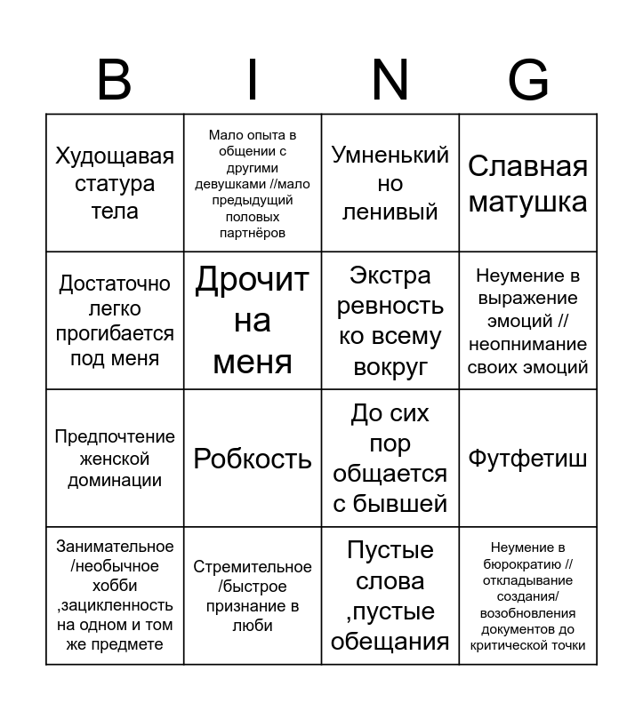 This bingo card has 16 words: Стремительное /быстрое признание в люби, Футфетиш, Умненький но ленивый, Худощавая статура тела, Предпочтение женской доминации, Мало опыта в общении с другими девушками //мало предыдущий половых партнёров, До сих пор общается с бывшей, Пустые слова ,пустые обещания, Достаточно легко прогибается под меня, Дрочит на меня, Занимательное /необычное хобби ,зацикленность на одном и том же предмете, Славная матушка, Робкость, Неумение в выражение эмоций //неопнимание своих эмоций, Экстра ревность ко всему вокруг and Неумение в бюрократию //откладывание создания/возобновления документов до критической точки.