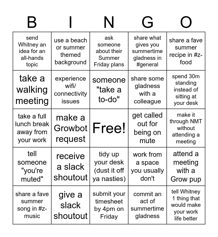 This bingo card has a free space and 24 words: receive a slack shoutout, give a slack shoutout, someone "take a to-do", share a fave summer song in #z-music, share a fave summer recipe in #z-food, send Whitney an idea for an all-hands topic, take a walking meeting, use a beach or summer themed background, get called out for being on mute, tidy up your desk (dust it off ya nasties), share some gladness with a colleague, take a full lunch break away from your work, work from a space you usually don't, attend a meeting with a Grow pup, experience wifi/ connectivity issues, commit an act of summertime gladness, make it through NMT without attending a meeting, ask someone about their Summer Friday plans, spend 30m standing instead of sitting at your desk, make a Growbot request, tell Whitney 1 thing that would make your work life better, tell someone "you're muted", share what gives you summertime gladness in #general and submit your timesheet by 4pm on Friday.