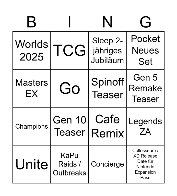 This bingo card has 16 words: KaPu Raids / Outbreaks, Legends ZA, Sleep 2-jähriges Jubiläum, Worlds 2025, Champions, TCG, Cafe Remix, Concierge, Masters EX, Go, Unite, Pocket Neues Set, Gen 10 Teaser, Gen 5 Remake Teaser, Spinoff Teaser and Collosseum / XD Release Date für Nintendo Expansion Pass.