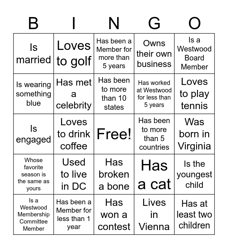 This bingo card has a free space and 34 words: Was born on an island, Lives in Vienna, Lives outside of Vienna, Has at least 2 siblings, Whose favorite season is the same as yours, Has met a celebrity, Is a Westwood Board Member, Is a Westwood Membership Committee Member, Loves to golf, Has worked at Westwood for more than 5 years, Has been to more than 10 states, Has been a Member for more than 5 years, Has been a Member for more than 10 years, Has twins, Has been to more than 5 countries, Loves to play tennis, Has been a Member for less than 1 year, Is engaged, Used to live in DC, Has a cat, Has broken a bone, Has a dog, Is married, Was born in Virginia, Has won a contest, Has at least two children, Owns their own business, Has the same favorite color as you, Has worked at Westwood for less than 5 years, Is wearing something blue, Speaks multiple languages, Loves to drink coffee, Is the youngest child and Is the oldest child.
