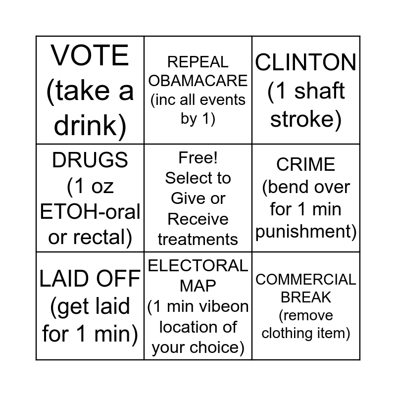 This bingo card has a free space and 8 words: CRIME (bend over for 1 min punishment), CLINTON (1 shaft stroke), REPEAL OBAMACARE (inc all events by 1), LAID OFF (get laid for 1 min), VOTE (take a drink), COMMERCIAL BREAK (remove clothing item), DRUGS (1 oz ETOH-oral or rectal) and ELECTORAL MAP (1 min vibeon location of your choice).