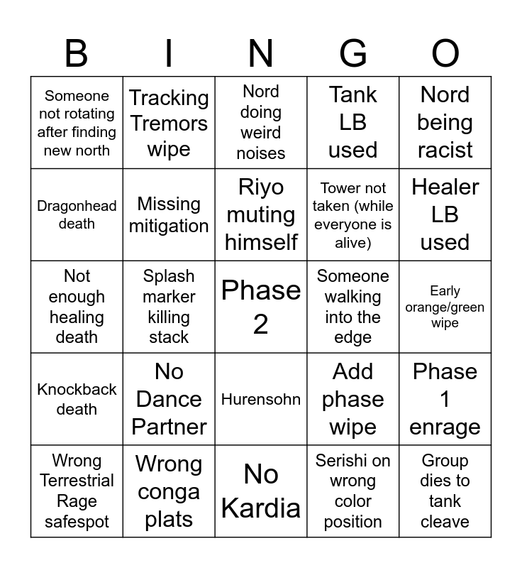 This bingo card has a free space and 24 words: No Dance Partner, Wrong conga plats, Riyo muting himself, Wrong Terrestrial Rage safespot, Nord being racist, Someone not rotating after finding new north, Dragonhead death, Tracking Tremors wipe, Someone walking into the edge, Hurensohn, Tower not taken (while everyone is alive), Not enough healing death, Add phase wipe, Phase 1 enrage, Missing mitigation, Serishi on wrong color position, Early orange/green wipe, Nord doing weird noises, Healer LB used, Splash marker killing stack, Group dies to tank cleave, Knockback death, Tank LB used and No Kardia.