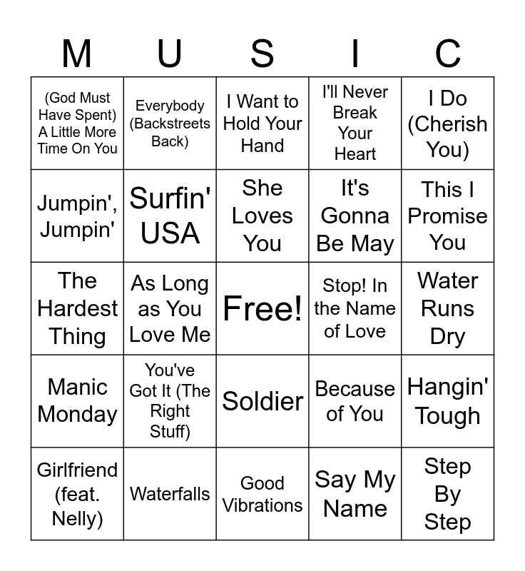 This bingo card has a free space and 72 words: I Want It That Way, Everybody (Backstreets Back), As Long as You Love Me, Larger Than Life, Quit Playing Games (With My Heart), Show Me The Meaning of Being Lonely, I'll Never Break Your Heart, Bye Bye Bye, It's Gonna Be May, Tearin' Up My Heart, Girlfriend (feat. Nelly), I Want You Back, This I Promise You, (God Must Have Spent) A Little More Time On You, All or Nothing, The Hardest Thing, Because of You, I Do (Cherish You), I'll Make Love You, Water Runs Dry, You've Got It (The Right Stuff), Step By Step, Hangin' Tough, Sucker, Year 3000, Lovebug, What Makes You Beautiful, Night Changes, Story of My Life, No Scrubs, Waterfalls, Creep, Unpretty, Red Light Special, Say My Name, Independent Women, Pt. 1, Bills, Bills, Bills, Survivor, Jumpin', Jumpin', Bootylicious, Soldier, Wannabe, Say You'll Be There, Spice Up Your Life, Walk Like an Egyptian, Manic Monday, Don't Let Go (Love), My Lovin' (You're Never Gonna Get It), Whatta Man, Shoop, We Are Family, Baby Love, Where Did Our Love Go, Stop! In the Name of Love, Someday We'll Be Together, Help!, I Want to Hold Your Hand, She Loves You, Can't Buy Me Love, Ticket to Ride, Day Tripper, A Hard Day's Night, Hello Goodbye, Good Vibrations, Wouldn't It Be Nice, I Get Around, Surfin' USA, California Girls, What's Up?, Don't Cha, Stickwitu and Buttons.